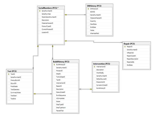 is the key table. This contains an identifying serial number, which could represent any one of a set of components. But where the action really is at is the BuildHistory table. This starts out initially as a plain, bland copy of all the steps in our process model in the first section – linked with the StepID field. But there’s a set of attributes there that aren’t found in the Step table – things like StepTypeInput, PassedTest, IsCompleted, etc. This tells us what happened to the part as it hit this step of the process. Did it pass every test? Were there notes that the operator needs to jot down to help diagnose production issues? We chose to partition the SerialNumbers table into two pieces – the second (Test) shows test-specific attributes that only apply to final assemblies, including the final grade (A/B/F) and test start/end times. One SerialNumbers record (a part) can have one or more Interventions, where a defective part either has to be kicked onto a repair spur and either fixed and put back on the line or sent out for repairs. SNHistory tracks the record of our finished good as it is assembled into a chain of components and subassemblies.