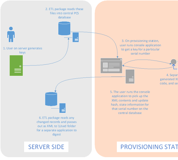 Basically this is a software key provisioning process, where a central server acts as a key repository – holding a pool of allocated keys. There could be 20 or more provisioning stations that need to pull down these keys, one at a time, and assign it to a serial number – add a hash code, and pass it back to the central database for more processing. Above, we have a “user” running this console application – but since it will be hands-free, writing this as an ETL package (on the server side of things, to handle license requests and keep track of assigned serial numbers) for the server side, and pairing it up with a simple console application that can get kicked off command-line on the individual stations made sense.