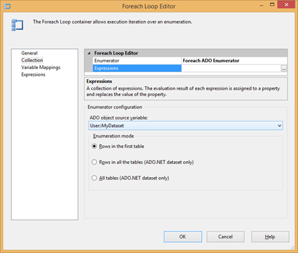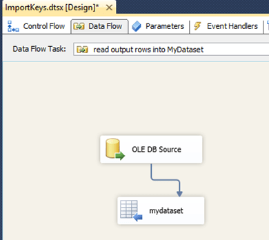 However, the Output SSIS package was funky. Following the steps in this post, I added a data flow to output to an ADO.NET recordset, and then added a ForEach loop against that source.