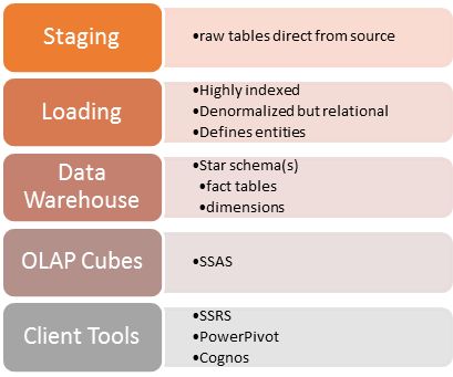 Let’s not get bogged down in details here, but you want to have a staging area that contains your raw tables (and deltas) – this looks EXACTLY like the source data, without relational ties (or even indexes to keep load times to a minimum). Sometimes I drop and add indexes post-load to cut down on ETL times. Your loading area contains consumable objects that are multi-purpose and generic – think a “Products”, “Customers”, and “Suppliers” set of tables, where each row defines a customer, a supplier, etc. This is a relational store but not a OLTP system- you won’t (or shouldn’t) be seeing tons of lookup tables here. Think very flat, breaking some rules with denormalization (i.e. ProductCategory1, ProductCategory2, etc) in the name of performance. The goal here is a set of objects that will be a “one stop shop” of data, hopefully robust enough to survive organizational change with a minimum of bloodshed. For example, currently we’re writing a DW based on an ERP that we’re ‘pretty sure’ will be going away in three months. But I’m reasonably sure, even if we cut over to SAP, that I’ll still have a table of “Items”, “Products”, etc. By having a staging area, I minimize disruption to our users that are becoming dependent on our reports.