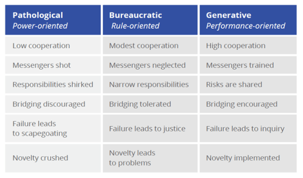 A study by Westrum in 2004 divided organizations into three general categories, based on their orientation and base characteristics. Is your company Pathological, Bureaucratic, or Generative?