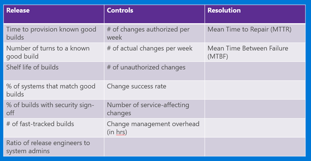 - This has to do with gathering metrics and measuring improvement along three lines – release, controls, and resolution.