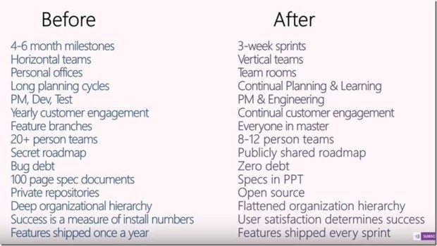 The big picture that’s changed for us as a company is the realization that doing this big-bang, waterfall, shipping everything in 9 months or more mega-events just doesn’t cut it anymore. We used to do those vast releases – a huge flow of bits like water, we called it a tsunami release. Well just like with a real tsunami there’s a wave of devastation after the delivery of these large platforms all at once that can take months of cleanup. We’ve changed from tsunami thinking to ripples with much faster, more frequent releases.
