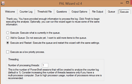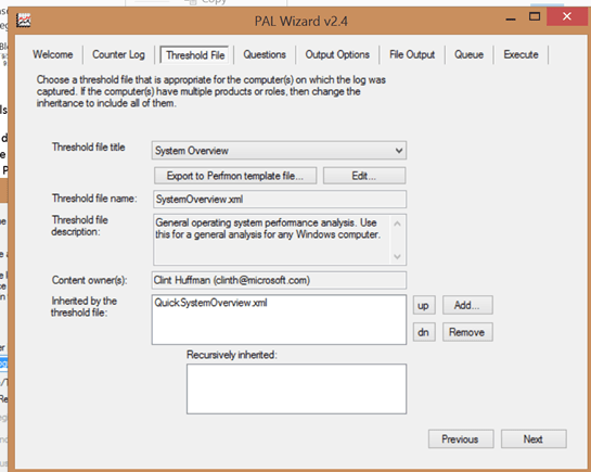 In the Threshold File page notice the long list of threshold files you can choose from – anything from BizTalk to System Overview (good if you have no specific match) to ASP.NET to SQL Server 2008R2 etc. BEFORE you do this go to the Questions tab and make sure its set properly for your OS/# of CPU’s / available memory etc. Then go back to Threshold and select Export to Perfmon Template File.