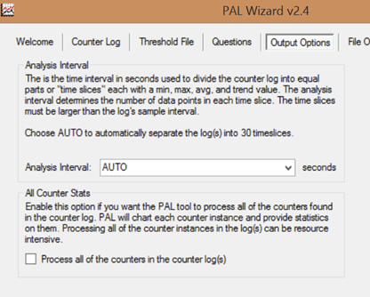 The tab above is worth a mention. Just select AUTO. You really don’t want to have it as more than that – a little too coarse of a grain to capture issues there – and anything less is WAY too fine. Trust me, with the number of counters we’re capturing, even with a very modest set it took PAL almost 12 minutes to finish compiling its report. 30 seconds is fine!